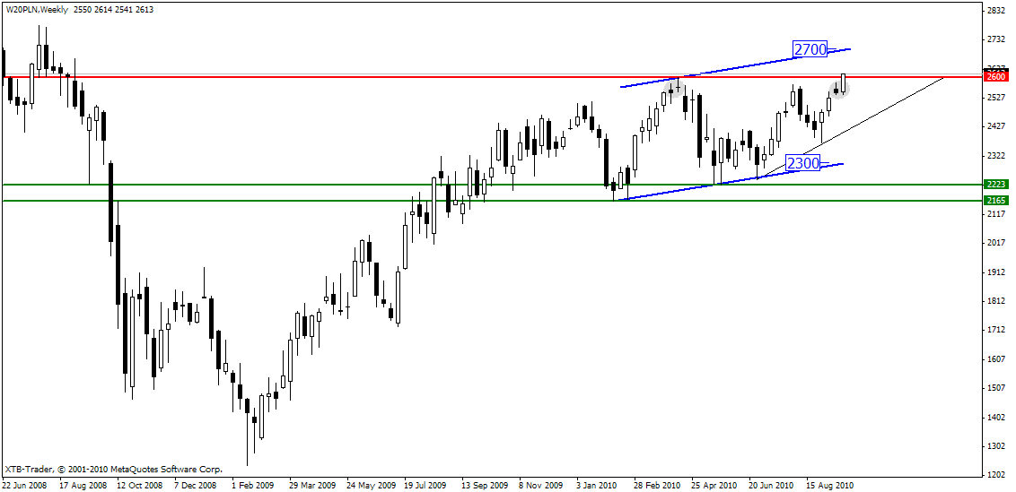 Lepsze dane zapewniły bardzo udaną końcówkę nieco nerwowego tygodnia na rynkach akcji. Wzrosty na rynkach globalnych był‚y ważnym impulsem dla kontraktów na warszawski WIG20. Mamy bowiem zamknięcie (tygodnia) na najwyższym w tym roku poziomie i długą białą tygodniową świecę po poprzedniej w formacji szpulki. Jeszcze w czwartek istniało ryzyko, iż zamiast długiej białej świecy tydzień zakończy się spadającą gwiazdą, co (mając na uwadze testowany opór z kwietnia) miał‚oby bardzo podażową wymowę. Tymczasem w obecnej sytuacji rynek ma otwartą drogę do górnego ograniczenia kanału wzrostowego, obecnie w okolicach 2700 pkt.