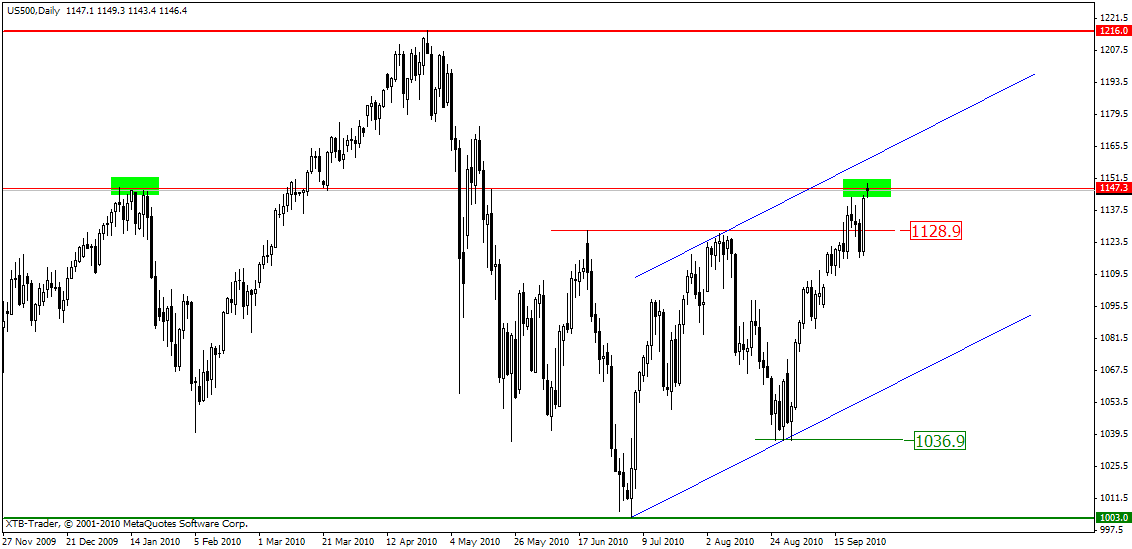Jako potencjalne ograniczenie warto zwrócić uwagę™ na sytuację na kontraktach na S&P500, gdzie po dotarciu do szczytów ze stycznia (1147 pkt.), rynek wyrysował dziś szpulkę. Na pocieszenie można zaznaczyć‡, iż Dow Jones jest już powyżej tych poziomów. Blisko maksimów są… też kontrakty na DAX30 i ten rynek również warto obserwować.
