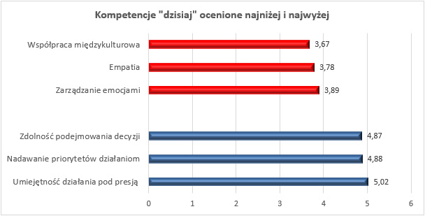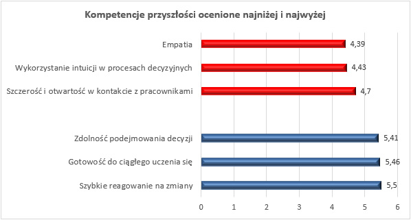 te dotyczące przystosowywania się do zmieniającej się rzeczywistości. Miejsca "na podium" zajęły kolejno: szybkie reagowanie na zmiany (5,5), gotowość do ciągłego uczenia się (5,46) oraz otwartość na nowe pomysły i działania (5,41). W pierwszej dziesiątce znalazły się też: aktywne poszukiwanie nowej wiedzy (5,28) i elastyczność w działaniu (5,28).